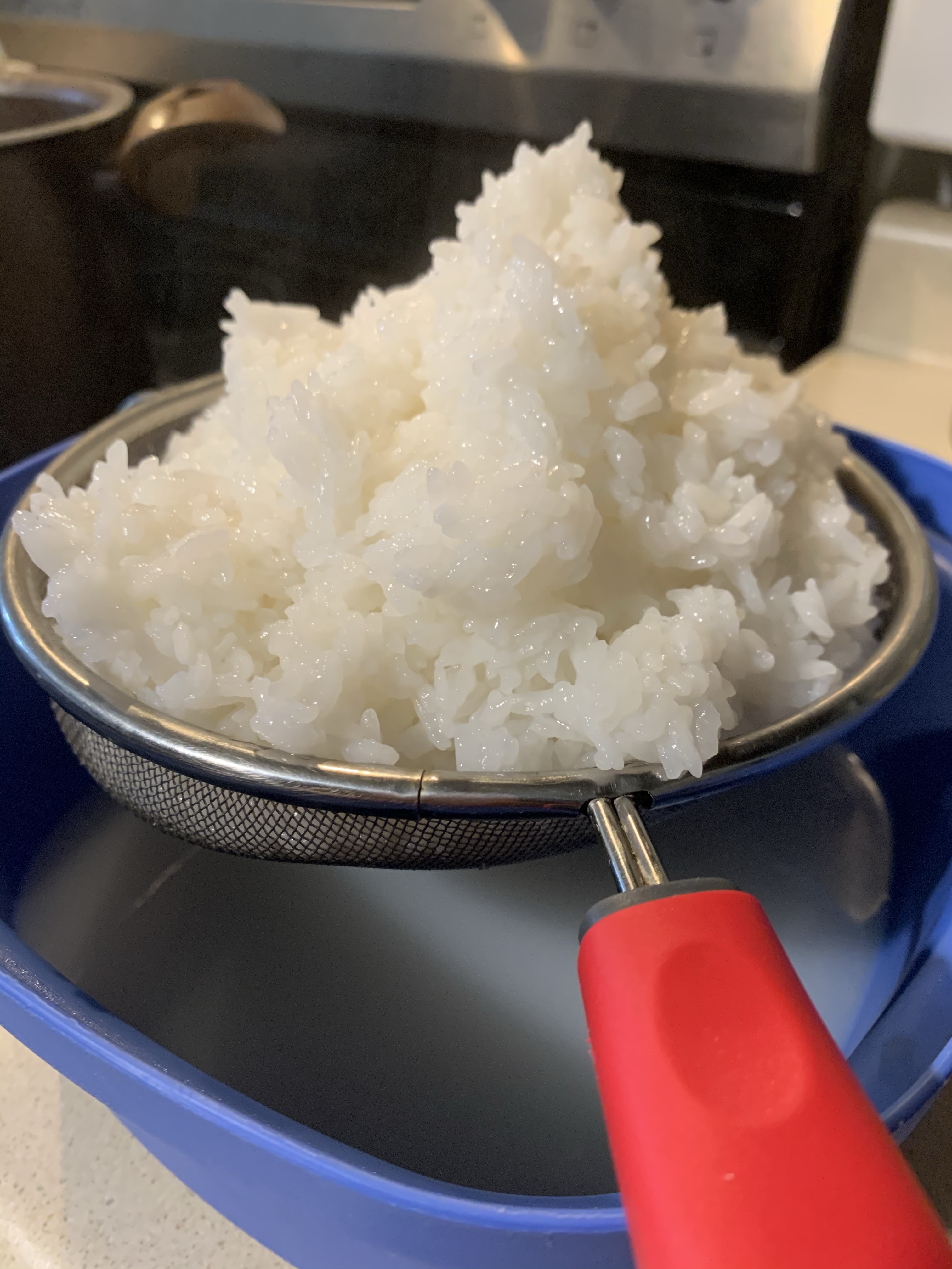 Cuando está suavecito lo sacan y lo ponen en coladora que se enfríe. Cuando este bien escurrido con la paleta háganle un hoyuelo al medio para que enfríe del centro, le agregan sal si le hiciera falta y las otras dos cucharadas restantes del vinagre de arroz. Cuando este frío lo meten a la refri. Una hora por lo menos.